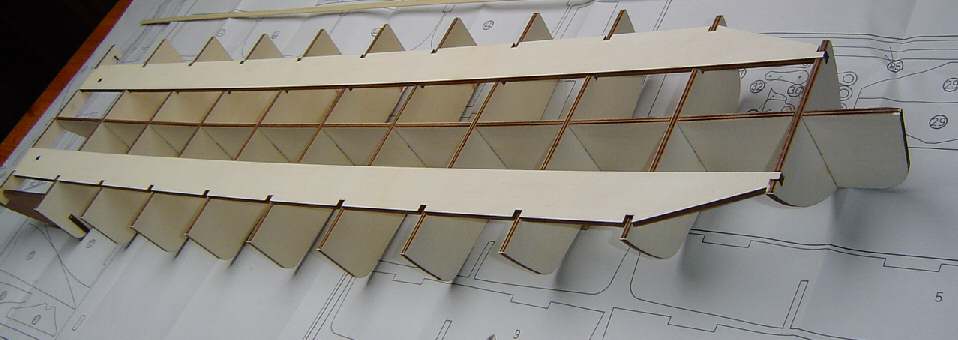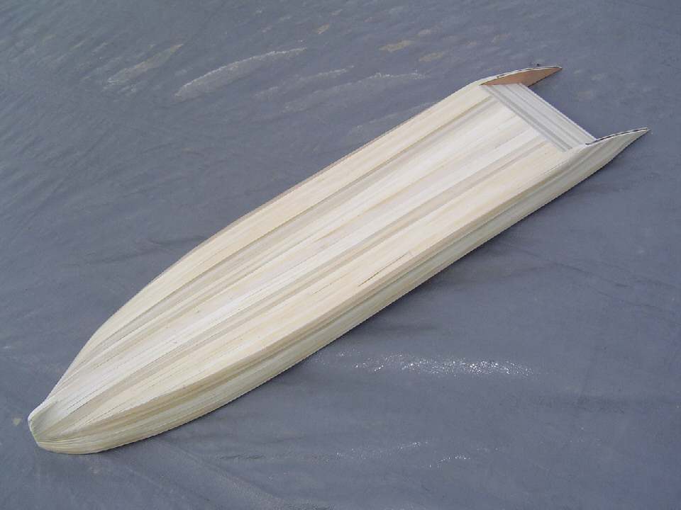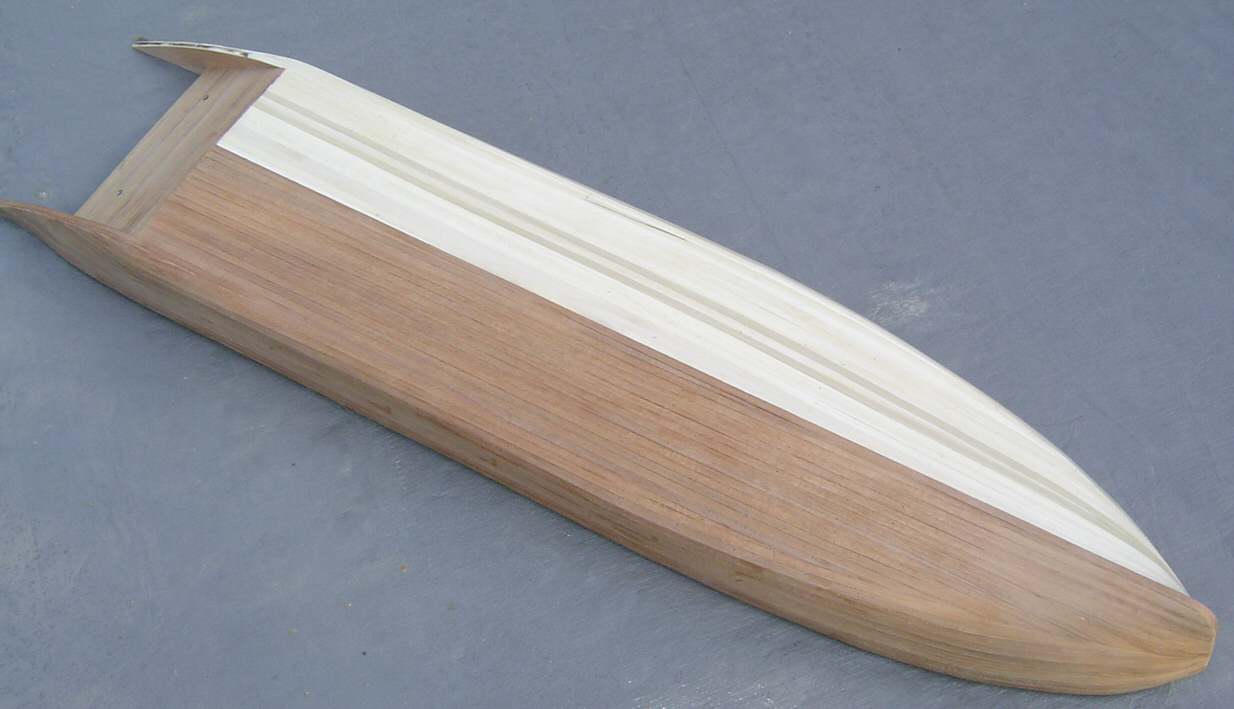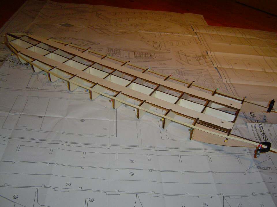 Jede Leiste, die an der Flanke befestigt wird, muss um ca. 160 mm zugespitzt werden und mit Nägelchen in Position gebracht werden, bevor sie angeklebt wird. Nach dem Anlegen von 9 Leisten pro Flanke, wird die zehnte Leiste in parallele Position gebracht, und zwar ungefähr 40 mm vom Kiel entfernt und indem man die Leisten abwechselnd anbringt, verkleidet man so den gesamten Rumpf.