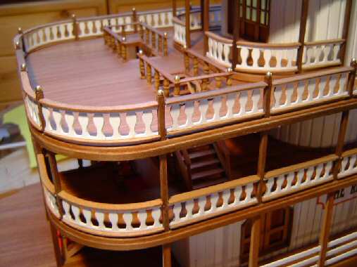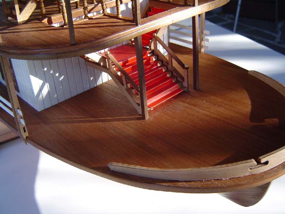 Figur 46 - Die Kamine erhält man von Rundhölzern von 6 mm, während die Deckel aus Rundhölzern von 8 mm o bestehen. Man lackiert sie schwarz, bevor man sie am Dach befestigt. Nachdem man das Dach an seinen Platz geklebt hat, bohrt man ein Loch in die Mitte der Kuppel zur Befestigung der Banderole. Man beendet die Arbeit mit der Anbringung des Treppchens, wobei man dessen Position auf den Abbildungen sehen kann.
