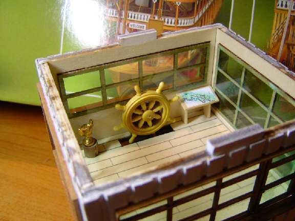 Figur 37 - Zur Konstruktion der eckigen Brüstungen am Heck, benutzt man das Geländer Nr. 69, während man die Brüstung in drei Stücke bricht, wie auf der Abbildung erkennbar ist.