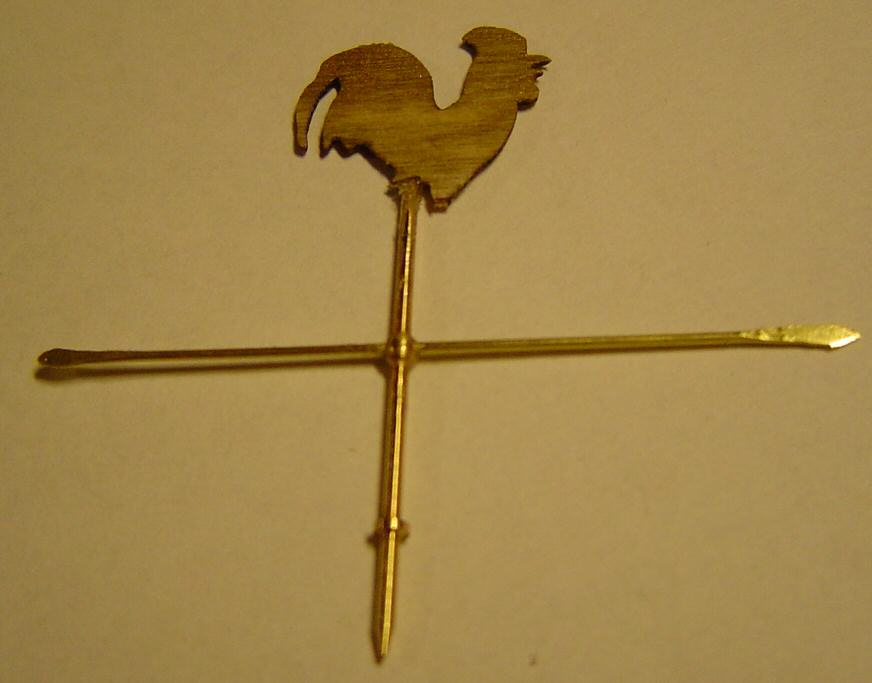 Figur 45 - Banderole. Mit einer Stichsäge für Metall, schneidet man ein Loch ins erste Auge der Stützstange. Dann zieht man ein Stück Messingdraht durch das zweite Loch und mit einem Hammer klopft man die beiden Enden des Drahtes platt. Man formt mit einer Schere die beiden plattgedrückten Enden in Form eines Pfeiles. Mit einem Tropfen Cyanacrylat, klebt man den Hahn an die Spitze der Stange.