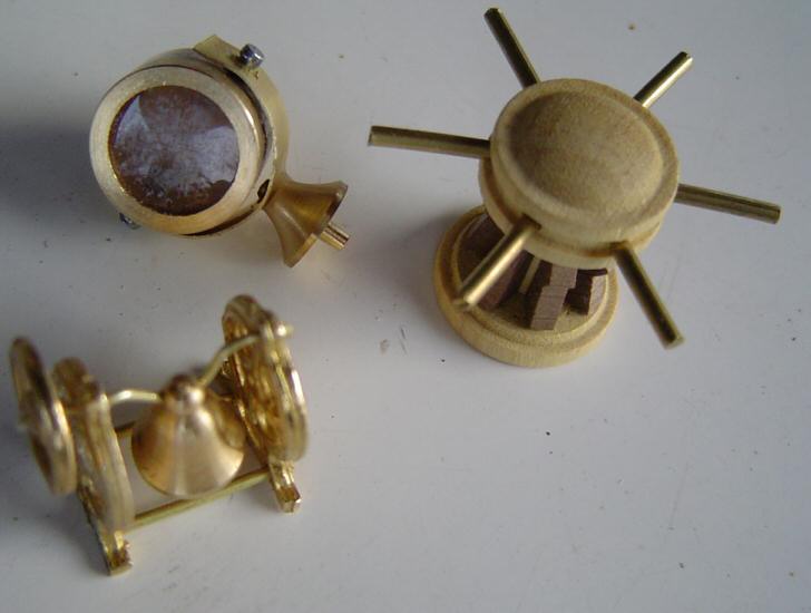 Figur 61 - Bugwinde. Mit einem Sockelschneider korrigiert man die Höhe der sechs einzusetzenden Elemente und klebt sie mit einem Tropfen Cyanacrylat fest. Dann steckt man die Messingstäbchen in die Löcher. Man lackiert mit Klarlack und setzt am Bug in Position.