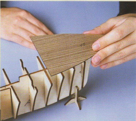 3. Deck 22 mit Holzleim versehen und auf die Rahmen 5, 6, 7 und die Stützteile von Spant 8 legen. Sorgfältig festkleben. Wenn nötig, können die Holzleimverbindungen mit Hilfe ultradünner Nägel fixiert werden. Noch besser arbeitet es sich mit Klebeband.