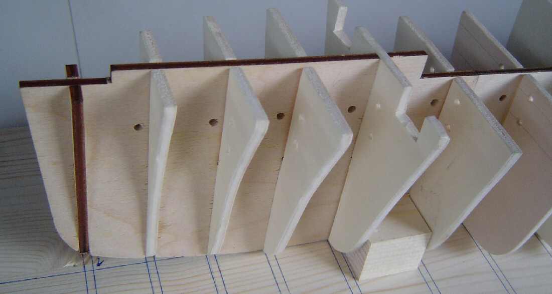1. Den Schlitz (24) des Kielstücks D mit Holzleim versehen. Dann den Spant 24 in den Schlitz einfügen und festkleben. Sollte der Schlitz zu weit sein, mit einem dünnen Holzstückchen passend machen.