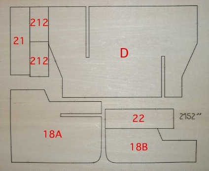 1. Die herausgedrückten Teile sorgfältig, besonders an den Kanten und in den Schlitzen, mit Sandpapier glätten. Sie ersparen sich so späteren Ärger beim Zusammenpassen. Teile 21 und 22 sowie die beiden Teile 212 sind zur Verstärkung der Verbindung zwischen den Spanten 18 A und 18 B bzw. die Kielstücke C und D bestimmt.