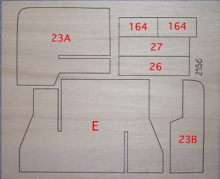 3. Jeweils eine Seite der beiden Teile 164 mit Holzleim versehen. Das eine Teil auf die Stoßkanten von 23 A und 23 B pressen und trocknen lassen. Vorgang mit dem anderen Teil 164 auf der Gegenseite des Spants 23 wiederholen.