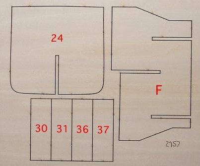 7. Die zwei Teile 36 und 37 aus Ausgabe 9 auf die beiden Seiten der Stoßstelle der Kielteile F und G kleben und gut trocknen lassen.