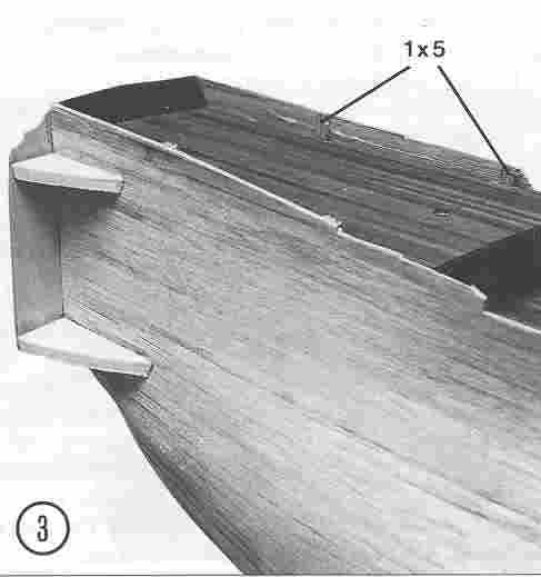 Wenn Sie die Unterbeplankung fertiggestellt haben und alle Nägel entfernt sind, verdünnen Sie etwas Weißleim mit Wasser und streichen ihn mit einem flachen Pinsel über die ganze Beplankung. Achten Sie darauf, daß alle Fugen gut mit Leim gefüllt sind. Erst wenn dieser Leimauftrag völlig ausgehärtet ist, ziehen Sie den Rumpf mit einem Glasscherben ab, um grobe Höhenunterschiede auszugleichen. Danach überschleifen Sie die Beplankung mit Sandpapier. Sollten Sie Dellen entdecken, können Sie jetzt noch mit Holzspachtel einiges ausgleichen. Keinesfalls darf hierbei aber eine dicke Schicht aufgetragen werden. Nunmehr ist der Rumpf fertig für die zweite Beplankung, für die Sie Nußbaumleisten 1 x5 mm verwenden. Den Anfang zeigt Foto 2. Auch bei der Außenbeplankung kleben Sie abwechselnd immer 2 Leisten an Backbord und Steuerbord auf. Gemäß Foto 3 bringen Sie noch die Schanzkleidstützen aus Nußbaum 1 x 5 mm an.