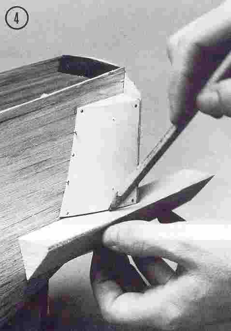 Kleben Sie die Wandstücke der Seitentaschen Nr. 40 an. Passen Sie die Unterteile der Seitentaschen gemäß Foto 4 an, indem Sie die Dreikantleisten aus Balsa entsprechend zuschneiden und entsprechend der Form der Gillung zuformen. Auf Bogen 4 ist die Profilform der Gillung von der Seite und von hinten gut zu erkennen. Beplanken Sie die Gillung mit Nußbaumleisten 1 x 5 mm, wie in Abbildung 12, Bogen 3, zu erkennen.