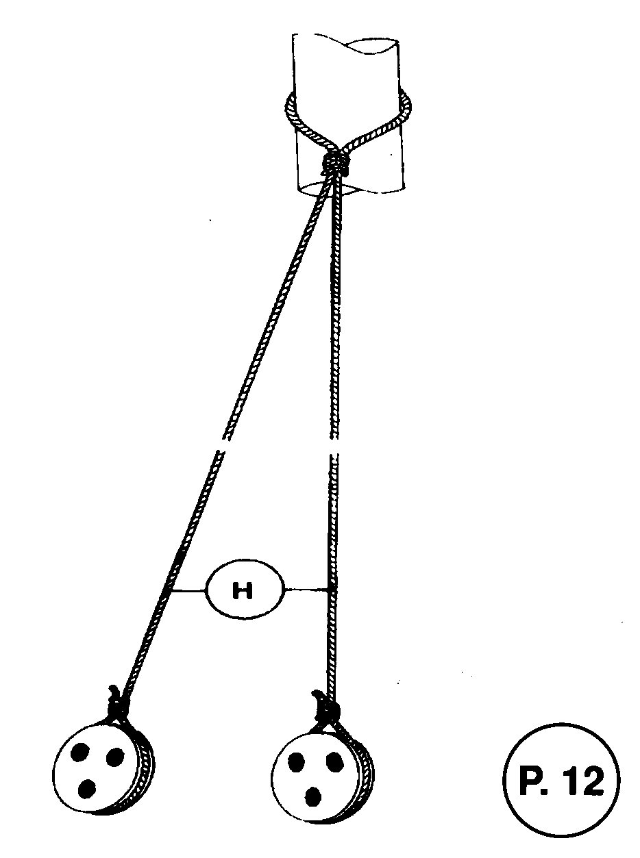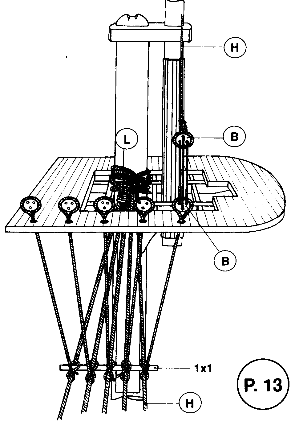 P 12 zeigt die Knüpfung der Wanten mit Legel um den Masttop und Stropp um die Want jungfern. Die Wanten werden durch die Öffnung der Mars (Katzenloch) nach unten geführt. Für eine gleichmäßige Höhe der Want- jungfern stellen Sie sich am besten einen Drahthaken her, der jeweils oben und unten in eine Jungfer greift. Die Befestigung der Püttingswanten an den Untermastwanten ist in P 13, die der Bramstengen in P 14 dargestellt.